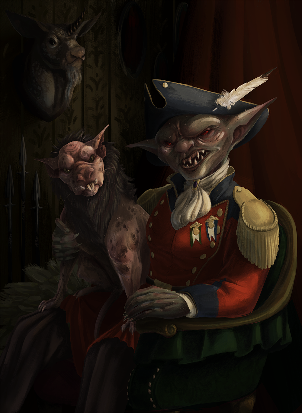 A portrait of an original hobgoblin character, and her beloved pet goblin dog.